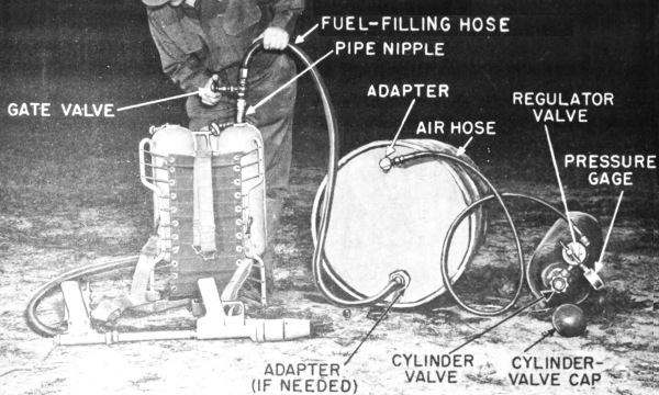 p. (Added). If compressed air is to be used, and if any grease, oil, or flame thrower fuel is detected by sense of smell or sight within pressure tank and valve assemblies or cylinders, return tanks or cylinders for cleaning to the appropriate third-echelon maintenance agency of Chemical Warfare Service.