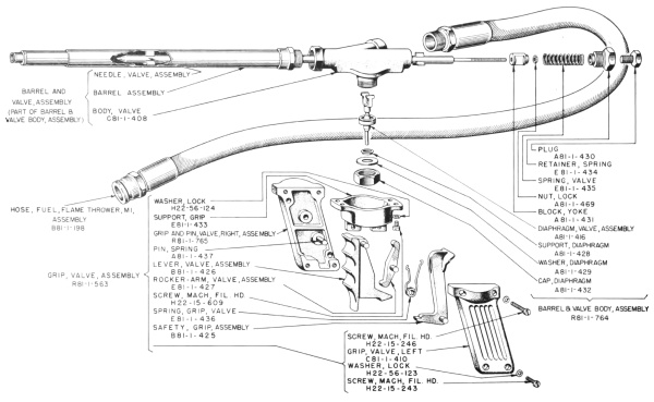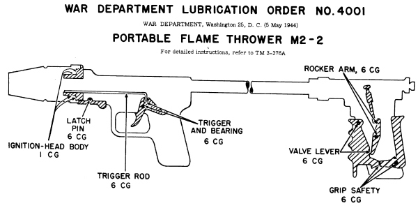 n. (Added). Hands and tools must be free of oil or grease when charging or servicing flame thrower pressure systems.