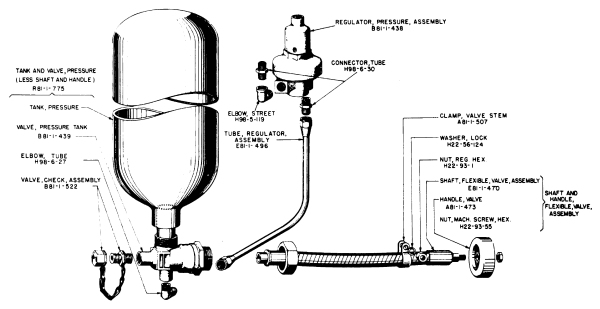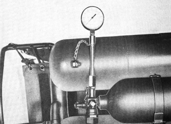 Figure 23. Charging two pressure tanks, using charging and filling lines, and cylinders of compressed air or nitrogen. As many as four pressure tank and valve assemblies, on or off tank groups, can be charged at one time from cylinders coupled as shown in figure 24.