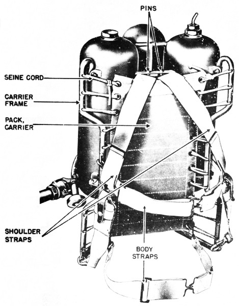d. (Superseded). Carefully remove tank group from the back. This may be done most easily by sitting or squatting with back to a tree stump, flat rock, packing box, or other object. Release the body and shoulder straps and ease tank group off the back. Avoid dropping equipment on the ground as this may damage it.