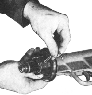 m. (Added). New gun may be received with valve spring removed from barrel and valve assembly. Spring comes tied to barrel. This is done to prevent strain on valve diaphragm assembly caused by pressure of spring in gun during storage and shipment. When weapon is being prepared for operation, spring must be untied from barrel and installed in gun, as described in paragraph 75.