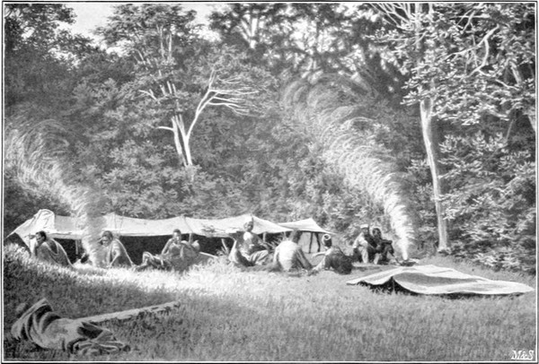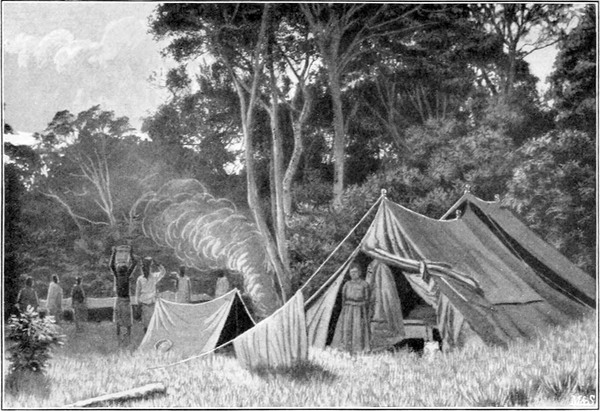 Im Lager wimmelte es wie in einem Ameisenhaufen, alles rührte sich in einer seltenen Geschäftigkeit. Die Zelte wurden aufgeschlagen, und rasch waren wir mit unseren liebenswürdigen Begleitern um den Frühstückstisch versammelt. Unsere niedlichen Frühstückskörbe, unsere Zelte, die Tische, Stühle und anderes Hausgerät, welches mein Mann für mich angeschafft hatte, wurde gebührend bewundert, dann aber auch fleißig getrunken und gegessen. Da es bald dunkel wurde, kehrten die Herren der Schutztruppe zurück, nachdem mein Mann ihnen für ihre Freundlichkeit gedankt hatte. Mit besonderem Danke sei hier noch einmal des Herrn v. Natzmer gedacht.