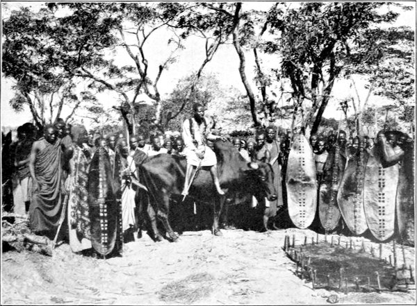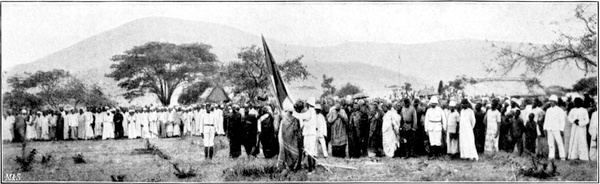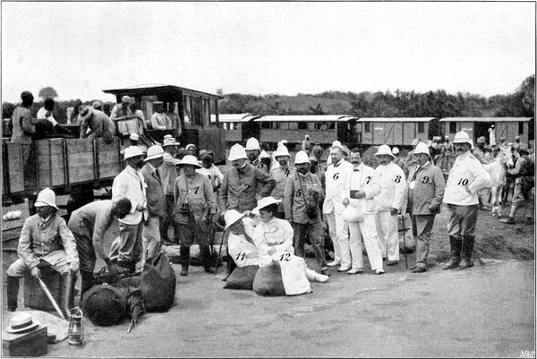 Eine so große Karawane hatte ich natürlich noch nie gesehen; auch anderen, die schon lange draußen waren, war sie etwas Neues.[S. 7] Wie ein unentwirrbarer Knäuel wälzte sich die Masse dahin. 130 Askaris (Soldaten), weit über 500 Träger, beladen mit Kisten der verschiedensten Arten, Paketen in Leinwand und in schwarzem Ledertuch, 1 Maxim- und 1 Berggeschütz, Zelte, Gewehre, Kästen mit Schweinen, Puten, Hühnern, Tauben, Enten, Schafen, Ananas, Mangos, Kokosnüssen, Weiber und Kinder in hellen oder vielmehr dunklen Haufen. Da beinahe jeder Askari zwei Boys (ich muß schon die bequeme englische Bezeichnung beibehalten, die sich in unserer Kolonie so fest eingebürgert hat, daß sie kaum noch zu verdrängen ist, umsoweniger, als es ein deutsches Wort, das diesen vielseitigen Begriff, der die ganze Stufenleiter vom „Silbendiener“ bis zum „Wichsier“ und „Putzkameraden“ umfaßt, nicht gibt) und zwei Weiber hat, der Träger aber auch von jeder Sorte eins, ist die Karawane gegen 1100 Mann stark. Die Askaris zogen voraus mit Pfeifen- und Trompetenschall, dann kamen sämtliche Offiziere der Schutztruppe, die uns bis zum ersten Lager begleiteten, zum Schluß die Träger mit ihrem Anhang, die mit dem üblichen Geschrei von den zurückbleibenden Abschied nahmen. Es war ein sinnbetäubender Lärm.