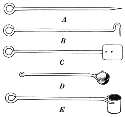 A, poker; B, rake; C, shovel; D, dipper; E, sprinkler.