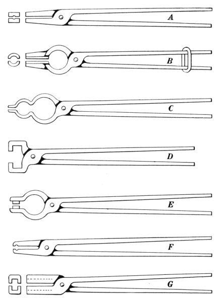 A, flat-jawed tongs; B, hollow bit tongs; C, pick-up tongs;