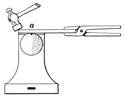 5. The Hammers.—Of the multitude of tools used by mechanics, the hammer is undoubtedly the most important one. There was a time when man had only his hands to work with, and from them he must have received his ideas for tools. Three prominent ones which are used extensively at present were most probably imitations of the human hand. From the act of grasping, man could easily have originated the vise or tongs for holding materials that he could not hold with the hand. Scratching with the finger nails undoubtedly impressed him with the need8 of something that would be effective on hard substances, and so he devised such tools as picks, chisels, and numerous other cutting instruments.
