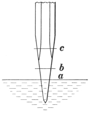 8. The straight peen hammer (C, Fig. 6) is shaped similarly to the ball peen hammer, except that the peen is flattened straight with the eye. It is convenient for drawing metal lengthwise rapidly.
