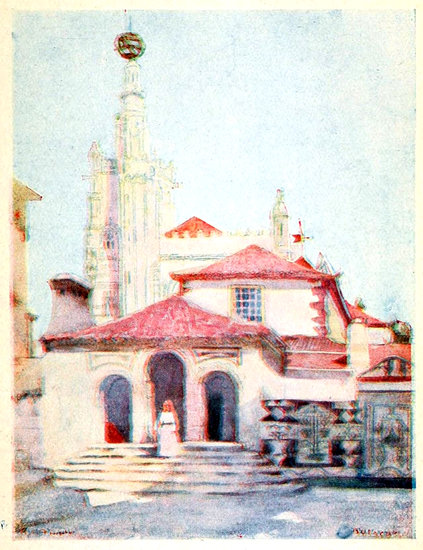 In the sacristy of Oporto Cathedral they will show you a painting on terra-cotta of the Virgin and Child, backed by St. Joseph and 22angels bearing a cross, which is asserted to be a Raphael. The composition and drawing are clearly the work of a disciple of his school, but the colouring is dull and grey, such as the great one of Urbino would never have produced. Not this so-called Raphael, but another picture of the highest interest and beauty, is the principal artistic treasure of the city. In the board-room of Oporto’s most cherished and beneficent institution, the vast charitable organisation called the Misericordia, there hangs a painting that has few, if any, equals in Portugal. It is claimed for Jan Van Eyck, who is known to have been in Portugal for two years at about the period (1520) represented by the work, though personally I could see but slight traces of the peculiar quality of either of the brothers Van Eyck. Certainly it is broader in style than anything I have seen from the brush of the younger brother Jan, and may well be the work of Hubert Van der Goes or Hans Memling. But, whoever may be the painter, the picture is a magnificent one. Against a background representing a typical Flemish landscape and walled town, such as Memling loved to paint, 23there is a highly ornamented font filled with a pool of blood replenished from the stream that issues from the Saviour’s side, as He hangs upon the cross rising from the centre of the pool. Upon the edge of the font, on each side of the cross, in attitudes of prayer, stand two lovely life-size figures of the Virgin and St. John, whilst in the foreground there kneel, in regal robes of crimson, ermine, and gold brocade, the figures of the founder of the Misericordia in 1499, King Manuel the Fortunate and his wife. Kneeling behind them in decreasing size are members of their family, and on the farther side beyond the font are groups of ecclesiastics and laymen, all evidently life-like portraits of prominent courtiers, or benefactors of the institution. The colouring of the picture is glowing and gorgeous in the extreme, and the loving care expended upon the details is such as only the early Flemings had patience to exercise, accompanied by a breadth and boldness unusual in most of them. Fons Vitæ, as the painting is called, from an inscription on the edge of the font, is emblematical of the foundation of the home of mercy it adorns. Nor is it the only art 24treasure the Misericordia possesses, apart from the hundreds of awful daubs representing dead and gone benefactors that crowd every inch of wall-space. There is to be seen a beautiful Gothic gold chalice of fifteenth-century Portuguese work, some fifteen inches high, a specimen of the famous handicraft of the city, of great interest, the work being of the most intricate and elaborate description, and the condition of the jewel perfect.