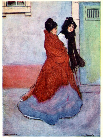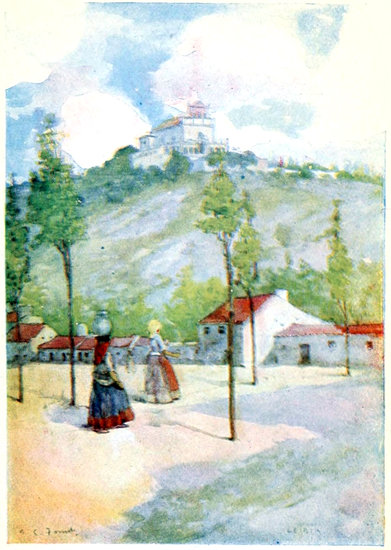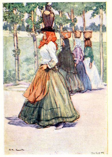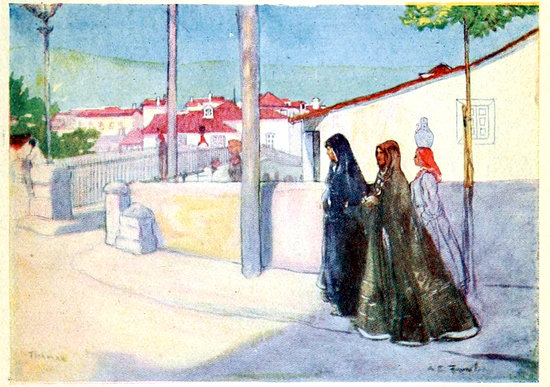29The manners of these people of North Portugal, indeed, are irreproachable. So courteous are they that it seems almost rude of the stranger to note too closely the quaint garb of the working people around him. The peasant women especially keep their ancient costume unchanged. Barefoot they go, old and young, with their heavy burdens piled in their boat-shaped baskets upon the black, pork-pie hats they wear. Their skirts, usually black but often with a broad horizontal stripe of colour round the bottom, are very short, and gathered with great fulness at the waist and over the hips. Upon the shoulders there is almost invariably a brilliantly coloured handkerchief, and sometimes another upon the head beneath the hat; and long, pendant, gold earrings shine against their coarse jet-black hair. It is evident that for the most part they work quite as hard as the men, but they have no appearance of privation or ill-treatment, except that their habit of carrying heavy weights upon their heads has the effect of ruining their figures in the manner already described. There are no indications anywhere of excessive drinking, and even smoking is not conspicuous amongst the 30working men and boys in the streets; they seem, indeed, too seriously busy for that, except on some feast day, when, with their best clothes on, they are gay enough, though not vociferous even then, as most southern peoples are.