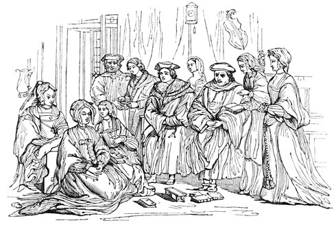 In 1520 he was made Treasurer of the Exchequer: he then bought a house by the river-side at Chelsea, where he had settled with his family. He had at that time buried his first wife and was married to a second. He continued in the King’s service full twenty years, during which time his royal master conferred with him on various subjects, including astronomy, geometry, and divinity; and frequently consulted him on his private concerns. More’s pleasant temper and witty conversation made him such a favourite at the palace, as almost to estrange him from his own family; and under these circumstances his peculiar humour manifested itself; for he so restrained the natural bias of his freedom and mirth as to render himself a less amusing companion, and at length to be seldom sent for but on occasions of business.