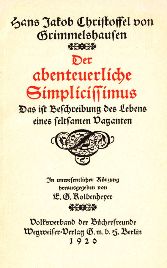 Der abenteuerliche Simplicissimus erschien 1669 in zweiter Auflage, die erste ging verloren. Der Volksverband der Bücherfreunde bringt durch seine Neuausgabe, die 1919 veranstaltet wurde, in Erinnerung, daß sich das Erscheinen des für die deutsche Literatur- und Sittengeschichte so bedeutungsvollen Kulturromans zum 250. Male jährt.
