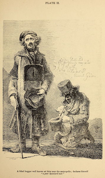A blind beggar well known at fairs near the metropolis; declares himself "a poor Spaniard man."