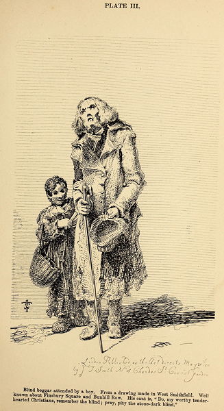 Blind beggar attended by a boy. From a drawing made in West Smithfield. Well known about Finsbury Square and Bunhill Row. His cant is, "Do, my worthy tender-hearted Christians, remember the blind; pray, pity the stone-dark blind."