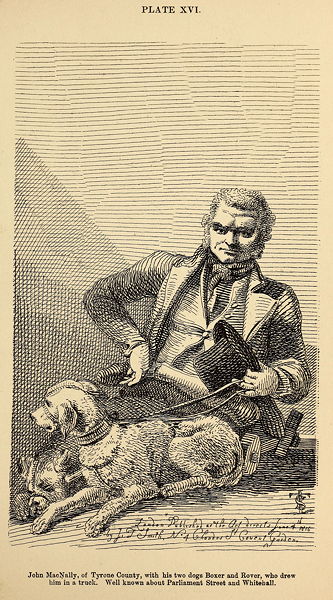 Dyball was remarkable for his leader, Nelson, whose tricks displayed in an extraordinary degree the sagacity and docility of the canine race. This dog would, at a word from his master, lead him to any part of the town he wished to traverse, and at so quick a pace, that both animals have been observed to get on much faster than any other streetwalkers. His business was to make a response to his master's "Pray pity the Blind" by an impressive whine, accompanied with uplifted eyes and an importunate turn of the head; and when his eyes have not caught those of the spectators, he has been seen to rub the tin box against their knees, to enforce his solicitations. When money was thrown into the box, he immediately put it down, took out the contents with his mouth, and, joyfully wagging his tail, carried them to his master. After this, for a moment or two, he would venture to smell about the spot; but as soon as his master uttered "Come, Sir," off he would go, to the extent of his string, with his tail between his legs, apprehensive of the effects of his master's corrective switch. This animal was presented to Dyball by Joseph Symmonds, the blind fiddler, who received him of James Garland, another blind beggar, who had taught him his tricks. Unfortunately for Dyball, this treasure has lately been stolen from him, as is supposed by some itinerant player, and he is now obliged to depend on a dog of inferior qualifications, though George has declared him to "Shew very pretty for tricks."