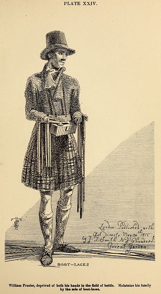 However, this fellow is now and then detected, in consequence of a picture, which is painted on a tin plate and fastened to his breast, being the portrait of and worn many years ago by a marine, who had lost his sight at Gibraltar. His hair, which is sometimes bushy, is now and then closely put under his hat, or tied in a tail; and when he alters his voice, he becomes a different character—the form of a decrepit vender of matches. The seated beggar in this plate is frequently to be seen at the wall of Privy Chambers; he never asks charity, nor goes any great distance from Westminster, where he resides.