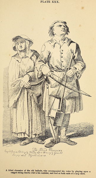 The next plate affords a remarkable instance of sobriety in a blind man, who never tasted gin in his life. He was some years since to be found on the historically and beggarly-famed road of Bethnal Green, and obtained an honest livelihood by trafficking in halfpenny ballads.