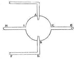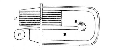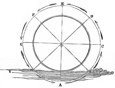 In a rude state of society, the motions required in the infant manufactures are communicated by the immediate application of the hand. Observation and reflection, however, soon suggest more easy and effectual means of attaining these ends: the strength of animals is first resorted to for the relief of human labour. Further reflection and inquiry suggest still better expedients. When we look around us in the natural world, we perceive inanimate matter undergoing various effects in which motion plays a conspicuous part: we see the falls of cataracts, the currents of rivers, the elevation (p. 19) and depression of the waters of the ocean, the currents of the atmosphere; and the question instantly arises, whether, without sharing our own means of subsistence with the animals whose force we use, we may not equally, or more effectually, derive the powers required from these various phenomena of nature? A difficulty, however, immediately presents itself: we require motion of a particular kind; but wind will not blow, nor water fall as we please, nor as suits our peculiar wants, but according to the fixed laws of nature. We want an upward motion; water falls downwards: we want a circular motion; wind blows in a straight line. The motions, therefore, which are in actual existence must be modified to suit our purposes: the means whereby these modifications are produced, are called machines. A machine, therefore, is an instrument interposed between some natural force or motion, and the object to which force or motion is desired to be transmitted. The construction of the machine is such as to modify the natural motion which is impressed upon it, so that it may transmit to the object to be moved that peculiar species of motion which it is required to have. To give a very obvious example, let us suppose that a circular or rotatory motion is required to be produced, and that the only natural source of motion at our command is a perpendicular fall of water: a wheel is provided, placed upon the axle destined to receive the rotatory motion; this wheel is furnished with cavities in its rim; the water is conducted into the cavities near the top of the wheel on one side; and being caught by these, its weight bears down that side of the wheel, the cavities on the opposite side being empty and in an inverted position. As the wheel turns, the cavities on the descending side discharge their contents as they arrive near the lowest point, and ascend empty on the other side. Thus a load of water is continually pressing down one side of the wheel, from which the other side is free, and a continued motion of rotation is produced.