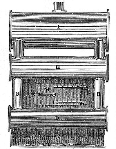 Propulsion by paddle-wheels. — Manner of driving them. — Marine Engine. — Its form and arrangement. — Proportion of its cylinder. — Injury to boilers by deposites and incrustation. — Not effectually removed by blowing out. — Mr. Samuel Hall's condenser. — Its advantages. — Originally (p. xvi) suggested by Watt. — Hall's steam saver. — Howard's vapour engine. — Morgan's paddle-wheels. — Limits of steam navigation. — Proportion of tonnage to power. — Average speed. — Consumption of fuel. — Iron Steamers. — American steam raft. — Steam navigation to India. — By Egypt and the Red Sea to Bombay. — By same route to Calcutta. — By Syria and the Euphrates to Bombay. — Steam communication with the United States from the west coast of Ireland to St. Johns, Halifax, and New York. 241