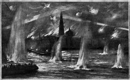Malheureusement, ces défenses ne pouvaient absolument pas préserver Anvers d'un sort fatal. Sa dernière nuit héroïque fut d'une sinistre beauté. Toutes les puissances destructrices semblaient liguées contre la cité illustre des Rubens, des Van Dyck, des Plautus, et le fameux siège de 1832 apparaît, auprès de ces horreurs, comme un simulacre, un tableau des grandes manœuvres. A l'horizon, la lueur rouge de l'incendie des réservoirs de pétrole, auxquels les Belges avaient mis le feu. Au ciel ardent, les mouvants faisceaux de lumière pâle des projecteurs électriques. Dans l'Escaut, de hautes colonnes d'eau soulevées par la chute des obus. Et, dominant ce spectacle de dévastation, la svelte tour de Notre-Dame, dressée comme un hautain défi aux pires sauvageries qu'ait vues l'histoire...