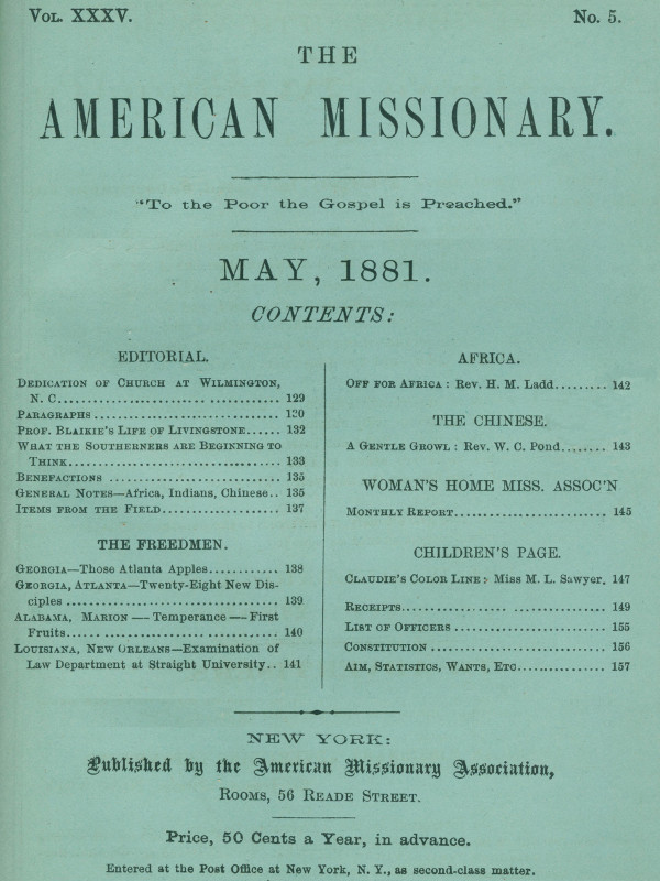 The Project Gutenberg EBook of The American Missionary -- Volume 35, No. 5, May, 1881, by Various This eBook is for the use of anyone anywhere in the United States and most other parts of the world at no cost and with almost no restrictions whatsoever. You may copy it, give it away or re-use it under the terms of the Project Gutenberg License included with this eBook or online at www.gutenberg.org. If you are not located in the United States, you'll have to check the laws of the country where you are located before using this ebook. Title: The American Missionary -- Volume 35, No. 5, May, 1881 Author: Various Release Date: September 4, 2017 [EBook #55486] Language: English Character set encoding: UTF-8 *** START OF THIS PROJECT GUTENBERG EBOOK AMERICAN MISSIONARY, MAY 1881 *** Produced by Joshua Hutchinson, KarenD and the Online Distributed Proofreading Team at http://www.pgdp.net (This file was produced from images generously made available by Cornell University Digital Collections)