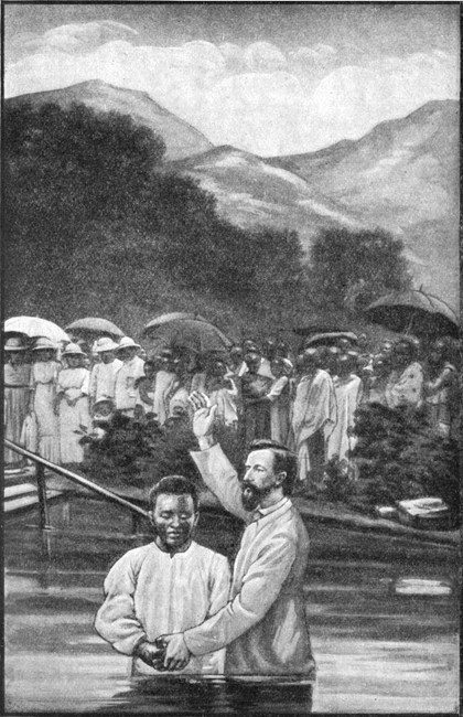 Von dieser Zeit an blieb die Taufe eine der wichtigsten Handlungen der Christenheit. Ganze Scharen traten in die Ströme, um von geweihten Händen die Christenweihe zu erhalten.[21] Sogar Könige stiegen von ihren Thronen, um die Taufe, das äußere Zeichen des Bundes, zu empfangen. Jesu Geist beseelte Völker und Fürsten, und der Glaube an ihn, an sein herrliches Evangelium und an seine Lehren verbreitete sich wie ein Lauffeuer über die entferntesten Länder des Erdballs.