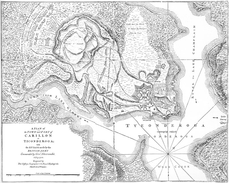 The three columns returned to the landing place on the 6th, and on the 7th the army again advanced, this time by way of the bridge over the small stream connecting Lake George with Lake Champlain. The French had destroyed the bridge in retreating but it was soon repaired. On the night of the 7th the whole army lay on their arms, in what is now the Village of Ticonderoga, and on the morning of the 8th advanced again in three columns to attack the Fort. In the meantime Montcalm had elected not to wait until the Fort was invested but to fight in the woods. With almost superhuman energy he threw an earthwork across the whole peninsula of Ticonderoga, about three-quarters of a mile from the Fort. It consisted of a great wall of logs, and an abatis of trees with their branches sharpened, a hundred feet or so from the trenches. He, himself, commanded the 31 center, the Chevalier de Lévis the right, and the Colonel de Bourlamaque the left. Early in the morning the British columns attacked. All through that hot, sultry July day the fight went on. Abercromby had established his headquarters at the French sawmill but had been deceived as to the strength of Montcalm’s defenses. In this fight the 42nd Highlanders, the famous Black Watch, suffered enormously. Many of the Highlanders fought their way through the abatis and some even reached the great log wall, only to be killed by bayonet or bullet. The Royal American, a regiment still in the British army as the King’s Royal Rifle Corps, had losses second only to the Black Watch. And at the end of the day Abercromby’s army was forced to retreat, leaving the French in command of the field. The British and Colonial losses in this fight were almost as great as the whole French defending force.