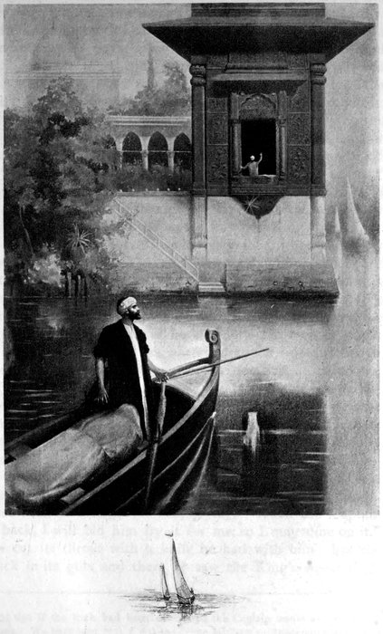 She pursued, It hath reached me, O auspicious King, that the young man continued:—So I said to myself, “Thou hast parted with thy soul and thy wealth is lost.” Then, of the excess of my chagrin, I betook myself to the Tigris and wrapping my face in my gown, cast myself into the stream. The bystanders saw me and cried, “For sure, this is because of some great trouble that hath betided him.” They cast themselves in after me and bringing me ashore, questioned me of my case. I told them what misadventure had befallen me and they condoled with me. Then an old man of them came to me and said, “Thou hast lost thy money, but why goest thou about to lose thy life and become of the people of The Fire?[39] Arise, come with me, that I may see thy lodging.” I went with him to my house and he sat with me awhile, till I waxed calmer, and becoming tranquil I thanked him and he went away. When he was gone, I was like to kill myself, but bethought me of the Future and the Fire; so I fared forth my house and fled to one of my friends and told him what had befallen me. He wept for pity of me and gave me fifty dinars, saying, “Take my advice and hie thee from Baghdad forthright and let this provide thee till thy heart be diverted from the love of her and thou forget her. Thy forbears were Secretaries and Scribes and thy handwriting is fine and thy breeding right good: 26seek out, then, whom thou wilt of the Intendants[40] and throw thyself on his bounty; thus haply Allah shall reunite thee with thy slave-girl.” I hearkened to his words (and indeed my mind was strengthened and I was somewhat comforted) and resolved to betake myself to Wásit,[41] where I had kinsfolk. So I went down to the river-side, where I saw a ship moored and the sailors embarking goods and goodly stuffs. I asked them to take me with them and carry me to Wasit; but they replied, “We cannot take thee on such wise, for the ship belongeth to a Hashimi.” However I tempted them with promise of passage-money and they said, “We cannot embark thee on this fashion;[42] but, if it must be, doff those fine clothes of thine and don sailor’s gear and sit with us as thou wert one of us.” I went away and buying somewhat of sailors’ clothes, put them on; after which I bought me also somewhat of provisions for the voyage; and, returning to the vessel, which was bound for Bassorah, embarked with the crew. But ere long I saw my slave-girl herself come on board, attended by two waiting-women; whereupon what was on me of chagrin subsided and I said in myself, “Now shall I see her and hear her singing, till we come to Bassorah.” Soon after, up rode the Hashimi, with a party of people, and they embarked aboard the ship, which dropped down the river with them. Presently the Hashimi brought out food and ate with the damsel, whilst the rest ate amidships. Then said he to her, “How long this abstinence from singing and permanence in this wailing and weeping? Thou art not the first that hath been parted from a beloved!” Wherefore I knew what she suffered for love of me. Then he hung a curtain before her along the gunwale and calling those who ate apart, sat down with them without the curtain; and I enquired concerning them and behold they were his brethren.[43] He set before them what they needed of wine and dessert, and they ceased not to press the damsel to sing, till she called for the lute and tuning it, intoned these two couplets:—