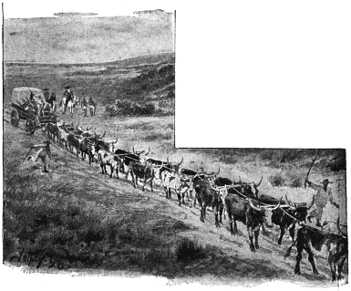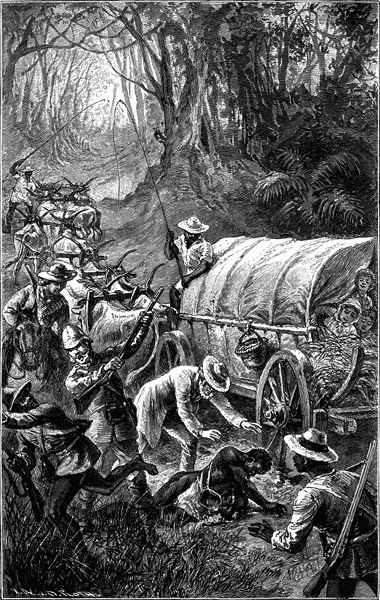 Als sich nach der Beendigung des nächtlichen Gottesdienstes unter den Familien der hier versammelten Buern die Nachricht verbreitete, daß Pieter Maritz allein zurückgekehrt war und seinen Vater verloren hatte, da erhob sich allgemeines Klagen. Es war ein schlimmer Tag gewesen. Außer Andries Buurman, der in der Höhle von Makapanspoort sein Leben ausgehaucht hatte, war noch ein anderer tapferer Mann im Kampfe tot geblieben, und drei Buern lagen an ihren Wunden danieder. Klaas Buurman, der Bruder des Andries und Oheim des Knaben Pieter Maritz, ließ sich von seinem Neffen erzählen, was geschehen war, und führte ihn dann zu einem der großen Wagen, wo die Familie des Verstorbenen wohnte. Hier lagen des Knaben jüngere Geschwister, eine stattliche Schar von fünf Knaben und drei Mädchen, in sanftem Schlummer unter der schirmenden, hochgewölbten Decke, neben dem Wagen aber war eine Frau von starkem Wuchse eifrig beschäftigt, für die Zugochsen zu sorgen. Zwei Schwarze in wollenen Hemden mit nackten Armen und Beinen gingen ihr dabei gehorsam zur Hand, schütteten den Tieren Heu vor, gaben ihnen Wasser und wuschen ihnen die vom Joche wund gedrückten starken Nacken.[S. 15] So erfüllte die wackere Gattin außer den Pflichten der Mutter auch die des Hausherrn.