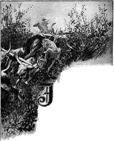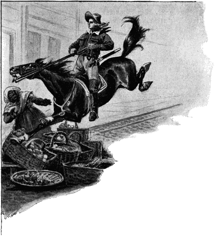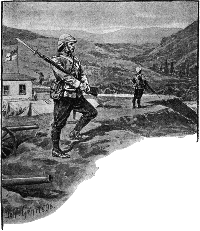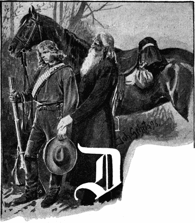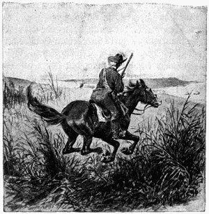 Der Reiter war von gewaltigem Wuchse, breit von Brust und Schultern und mit langen Beinen. Er hatte ein kriegerisches Aussehen, obwohl keine Abzeichen militärischer Art seinen Anzug als den eines Soldaten kenntlich machten. Sein Gesicht war von Wind und Wetter gebräunt, ein Hut mit sehr breitem Rande bedeckte[S. 2] sein Haupt, über der dunkelgrauen Bluse trug er einen Gurt von Büffelleder, an welchem ein Hirschfänger herabhing; über die eine Schulter gehängt war ein breiter Lederriemen, der der ganzen Länge nach mit metallenen Patronen besteckt war, und über der anderen Schulter trug er eine Büchse. Seine Füße steckten in hohen, bis zum Knie reichenden Stiefeln mit schweren Sporen.
