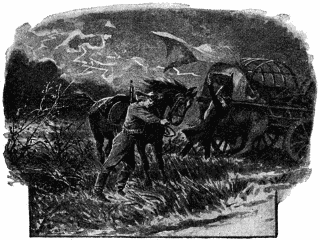 Aber die Sonne neigte sich zum Untergange. Ihre schrägen Strahlen übergossen das Land mit rotgoldenem Lichte und ließen das Heidekraut, über welches die Hufe des Rosses dahineilten, weithin, soweit das Auge blickte, wie einen roten Teppich erscheinen. Der Schatten von Roß und Reiter war riesengroß angewachsen und begleitete den eiligen Ritt gleich einer am Boden hinfliegenden sonderbar gestalteten Wolke. Jetzt sank die Sonne unter den Horizont, und mit einem Schlage verbreitete sich völlige Finsternis über Himmel und Erde. Pieter Maritz spähte sorgenvoll umher. Was sollte er beginnen? Sollte er das Pferd anhalten und auf freier Ebene die Nacht verbringen? Aber schon hörte er in der Ferne den Ruf der Schakale und Hyänen, welche ihre Schlupfwinkel verließen, um ihrer Beute nachzugehen. Sollte er versuchen, beim Schein der jetzt am Himmel hell aufleuchtenden Sterne ein Gebüsch zu erreichen, wo er hoffen durfte, ein Feuer anzünden zu können, um die Raubtiere während der Nacht fern zu halten? Aber er fürchtete, durch den Schein des Feuers etwa umherstreifende[S. 11] Kaffern herbeizulocken, die ihm, dem einzelnen Knaben, gefährlich werden konnten. Er beschloß nichts zu thun, sondern im Sattel zu bleiben und sich ganz der Führung des Pferdes zu überlassen. Jager war mit Einbruch der Dunkelheit in Schritt verfallen und verschnaufte von dem meilenweiten schnellen Lauf. Er ging vorsichtig weiter und spitzte die Ohren. Der Knabe zog ein Stück getrocknetes Antilopenfleisch aus der Tasche und aß. Er hatte seit dem Morgen nichts genossen, und nur die Aufregung des ereignisreichen Tages hatte seinen Hunger betäubt. Jetzt aß er mit gierigem Appetit das ganze Fleisch, welches er bei sich trug, und trank dazu von dem Wasser, das er vorsichtigerweise in der Trinkflasche aus der Höhle mitgenommen hatte.