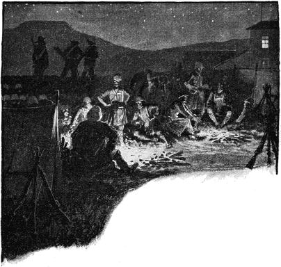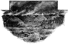 Da wurde der Knabe auf einen Schimmer aufmerksam, der gerade vor ihm mit mattem, rötlichem Schein den Himmel färbte. Der Schimmer war nahe über der Erde und verlor sich nach oben in einem weißlichen Streifen, gleich einer leichten Wolke. Er ward immer deutlicher, je weiter der Ritt ging, und frohe Hoffnung ließ des Knaben Herz lebhafter pochen. Er erkannte, daß der rote Schein nur von einem großen Feuer ausgehen konnte, und wo das Feuer war, da mußten auch Menschen sein. Seine Hoffnung täuschte ihn nicht. Bald sah er deutlich die roten Flammen mehrerer Lagerfeuer und den Qualm und Rauch brennender Rhenosterbüsche gen Himmel steigen.