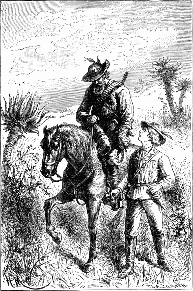 Der Knabe ging bis zum Ausgang der Höhle, und da er das Pferd nicht sah, setzte er die Hand an den Mund und ließ einen gellenden Pfiff von besonderer Art ertönen. Es währte nicht lange, da hörte er den Schritt des treuen Tieres, welches sich gehorsam näherte. Er streichelte es, umarmte seinen schlanken Hals und benetzte die seidenweiche Mähne mit Thränen. Es war ihm, als umarme er einen Freund, der seine einzige Stütze in großer Not sei. »Du und ich, alter Jager, wir sind jetzt allein,« sagte er, ihm die Nüstern liebkosend. Dann legte er ihm den Zaum an und schnallte ihm den Sattel auf den Rücken, verkürzte die Steigbügelriemen, so daß sie für ihn passend wurden, hing die schwere Büchse und den breiten Patronenriemen über die Schultern und stieg auf das Tier. Er war breitschulterig und stark gebaut, nach der Art seines Vaters, und wenn ihn auch dessen Ausrüstung belastete, so war ihm doch der Druck nicht zu schwer. Er warf noch einen Blick zurück, einen Blick, dessen Erinnerung sich für immer seinem Gemüte einprägte, und ritt dann den Weg zurück, den er gekommen war.