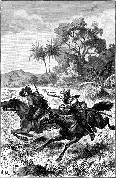 Auch dem Pferde war angst gewesen. Der Schweiß lief ihm vom Körper herab, obwohl es der vielen Steine und verschlungenen Wurzeln wegen hatte im Schritt gehen müssen. Sobald es jetzt auf die freie Ebene kam, schnob es tief und kräftig, hob den Kopf und setzte sich in den schnellsten Galopp. Pieter Maritz drückte den Hut fester auf den Kopf, beugte sich vor und ließ Jager laufen, wie er laufen wollte. Das Tier bewahrte die Schnelligkeit, durch die es berühmt war und die ihm den Namen Jager verschafft hatte, da es auf der Jagd das Wild von fern witterte, ehe noch der Reiter es erblicken konnte, und selbst die Antilope und den Strauß überholte. Wie die Windsbraut fegte Jager mit seiner leichten Last über die Ebene dahin.