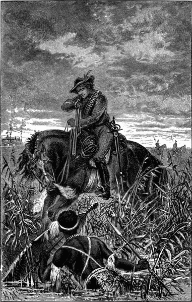 Welches aber der Grund davon war, daß das Tier so langsam ging und der Reiter sowohl wie der ihn begleitende Knabe so traurig aussahen, das war bei näherer Betrachtung leicht zu erkennen. Die linke Hand des Reiters hing bewegungslos an seiner Seite herab, und die Zügel lagen in der rechten. Dazu war diese gelähmte Hand mit einer Binde umwunden, welche von Blut gefärbt war, wie aus einer frischen Wunde. Außerdem aber war die Bluse auf der Brust mit dunkelroten Flecken reichlich bedeckt, und es war zu erkennen, daß auch hier, so nahe dem Sitze des Lebens, die Geschosse der Feinde bedrohlich gewirkt hatten. Auf diese Flecke und auf das Antlitz des verwundeten Mannes richteten sich die Blicke des besorgten Knaben an seiner Seite. Er hielt sich dicht am Pferde und war bereit, dem Vater eine Stütze zu sein, falls dieser etwa, vom Blutverlust geschwächt, nicht mehr imstande sein sollte, sich allein im Sattel zu halten. Er war ein kräftiger Knabe, dem Vater ähnlich an Gestalt. Unter seinem Hute hervor wallten blonde Locken bis auf den Kragen seiner Bluse herab und umrahmten ein frisches Gesicht mit hellen blauen Augen. Er war gleich dem Vater umgürtet und trug ein Waidmesser an der Hüfte, doch weiter keine Waffen. Ebenso trug er die hohen[S. 3] Stiefel, in welche die weiten Beinkleider hineingesteckt waren, doch keine Sporen.