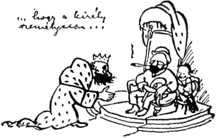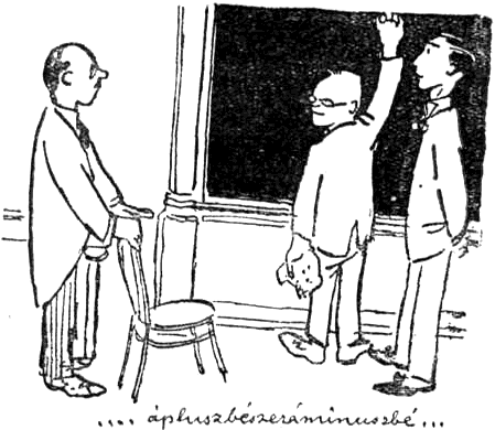 Na most!… Hadaink már bent járnak Szerbiában… Én azt hiszem, igazgató úr, -16- mégis csak ez a Bauer fogja megvédeni Magyarország határát. Mennyiségtanból rosszul áll, az igaz, de húsz saslengést csinál a nyújtón és mint fővezérnek, ez kell. Na Bauer, hát akkor csak neki, édes fiam… foglald el Szerbiát… így még kijavíthatod a négyesedet.