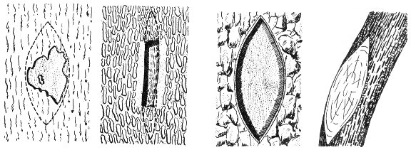 In addition to eliminating the stubs, other repairs might have to be made. In some cases the branches broke at their point of attachment on the parent limb and have peeled back the bark, leaving a jagged and irregular shaped wound. As indicated above, the new growth follows the easiest and smoothest path so that in such cases the wound needs to be shaped to allow for the quickest possible healing. From experience it has been found that a vertical elongated oval is the quickest to heal over, as it follows, as close as possible, the natural flow of material in a plant. This method is illustrated in the accompanying sketches.