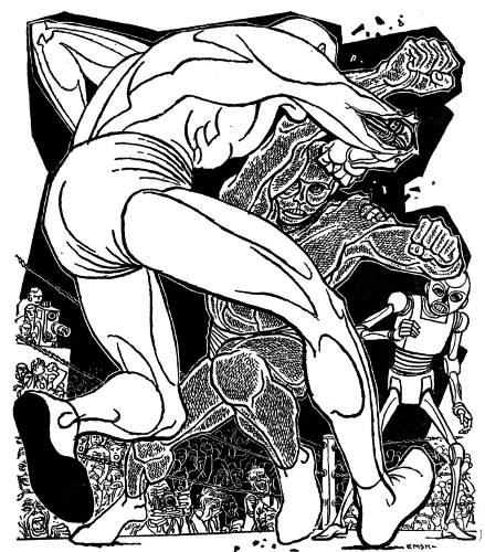 "Look at it this way. You've been knocked to pieces a dozen times, and I've gone to work and put you back together a dozen times. I've twisted your wires, re-shaped your reflex plan, doubled your flexibility and your punch-power, co-ordinated and re-co-ordinated you and re-analyzed your nervous-pattern until I've exhausted every possible combination. You're a fighting machine, and a good one, kid. But machines grow old. They get outdated, like me. I'm a Mechanical Engineer. Okay! There's lots of new stuff I don't know that these college kids know. What happens to them? They go to work for Pugilists Inc., inventing new machines with new systems. They got systems that I never dreamed of. Do you know that?"