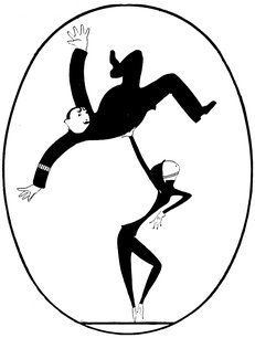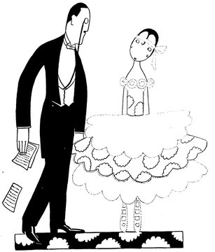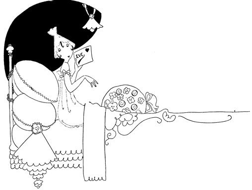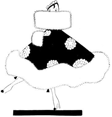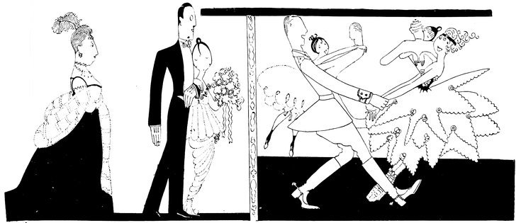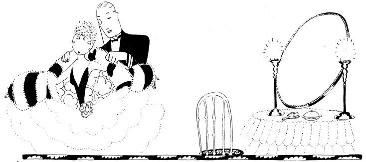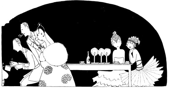 But in judging these fascinating drawings merely from the point of view of their humour and charm, one is apt to overlook the fact that Eve—while possessing a style which is unique—is also, and at the same time, a designer of remarkable gifts. It is, perhaps, as a designer that she will appeal most greatly to an artist. Each of her drawings is an exquisite example of this gift for design. Their line, their “proportion,” as it were, and the clever use she makes of black—big splashes of black—all help to make her drawings exquisite little pictures—“pictures” in the popular sense—as well as wonderful examples of technique and imagination. Another thing about all her drawings is their feminine daintiness. Each design is as dainty as the heroine who appears in nearly all of them. With a few strokes, a dot here and there, a line, she can suddenly bring before our eyes a perfectly-recognisable type. In this way her gifts are superior even to Phil May, who surely, more than many artists, obtained his effects with the least number of unessentials.