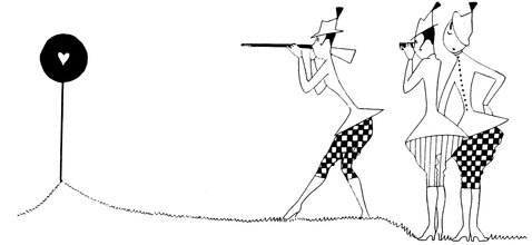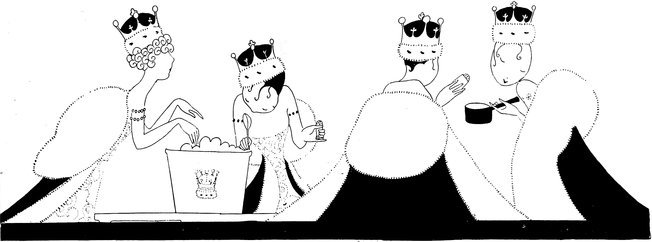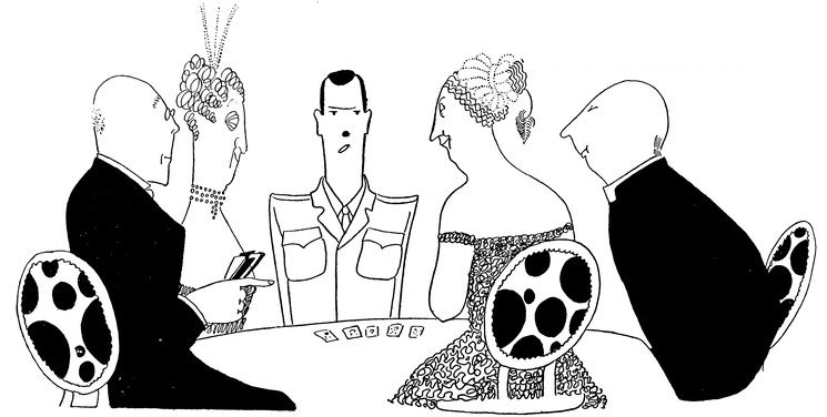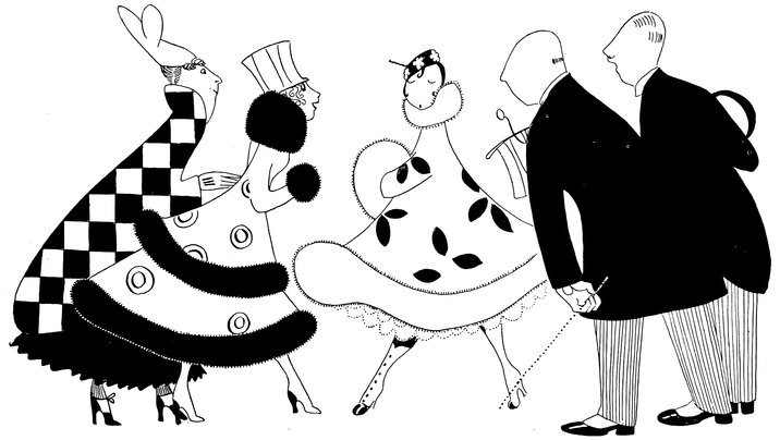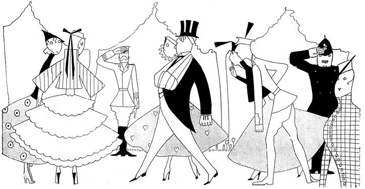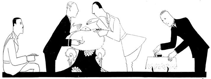 War economy proceeds apace, and Eve shows us that since brandy balls and “sich like” have taken the place of the tiny liqueur, society, straining after simplicity and innocence, has adopted a popular game reminiscent of our childhood. Adam, lucky man, drops the sweet, which the expectant fair catch in their tiny mouths