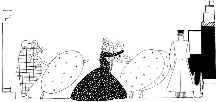 And last but not least, the gentlemen who invented the wide skirt are sentenced to be smothered in their own creations. We regret that Eve’s feelings should, after administering justice, have induced her to administer a most unjudicial poke with her parasol in the rear flank of the destroyer of her peace. Tou-Tou is also seen advancing to the attack