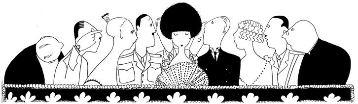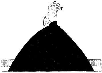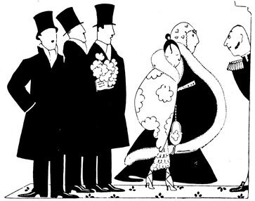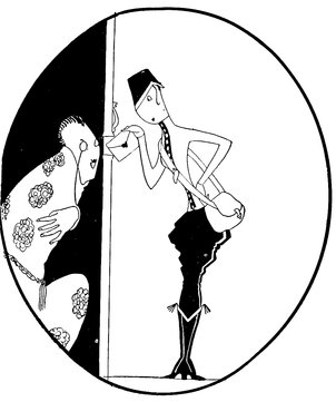 Few artists, however, have more quickly sprung into world-wide popularity than “Eve.” How great this popularity is may be judged by the numerous imitators which, while they copy many of Eve’s mannerisms, lose all that humour and spirit which make of Eve’s art such a fascinating and irresistible thing. For Eve possesses a gift which cannot be imitated, no matter how clever the artist who imitates her may be. Each person’s sense of humour—or lack of it—belongs to them alone. And it is Eve’s humour which make her delightful drawings so appealing. She has that sense of the “absurd” which is one of the rarest senses in all black-and-white art. And yet, while her irresistible humour makes one laugh, while her drawings fascinate us by their quaintness, she is never so far removed from reality as to be merely a painter of the human grotesque. Therein lies so much of her genius. She paints humanity with the eye of one who can see the comic in everyday people and things, and yet she never lets her feeling for the ridiculous obliterate her feeling for Truth. It is to be regretted that the clever letters which these drawings originally illustrated in “The Tatler” cannot be reproduced on account of their topicality.