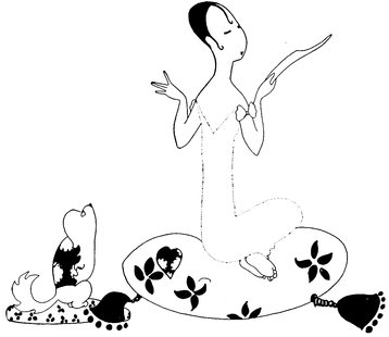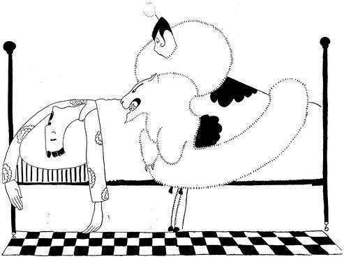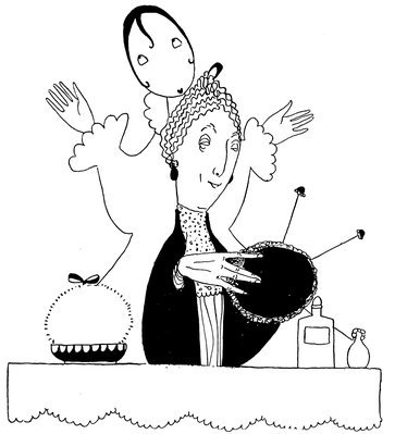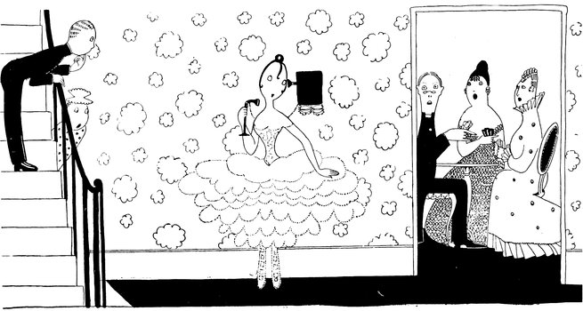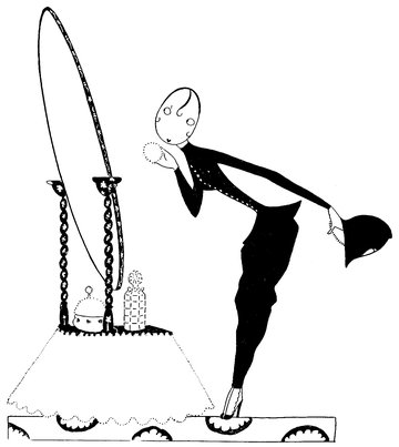 Here we have a vivid picture of Eve, hamper packed and ready (Tou-Tou on guard), keeping one eye open for the alarm. A considerable clamour awakens her, so—
