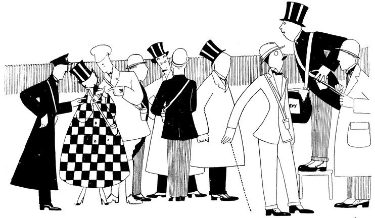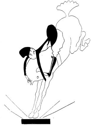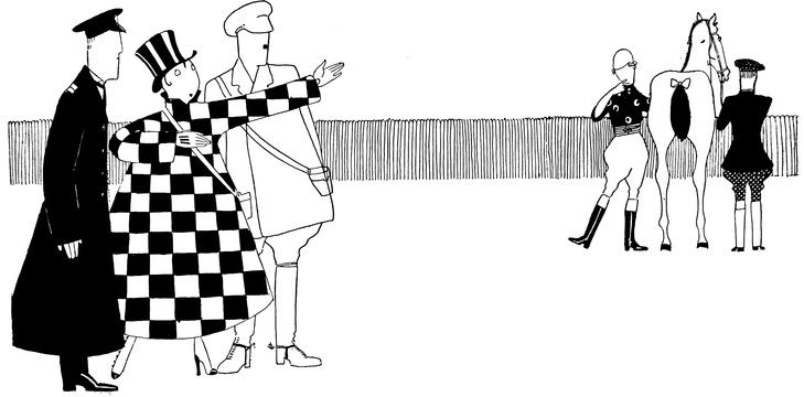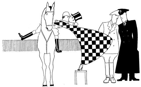 —but, of course, Eve’s charger rolls home first, and her feelings overcome her to such an extent that she embraces the attractive jockey in the open. (We regret that the horse, which is on the left of the picture, has only two legs. Eve refuses to draw any more for the money)