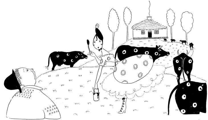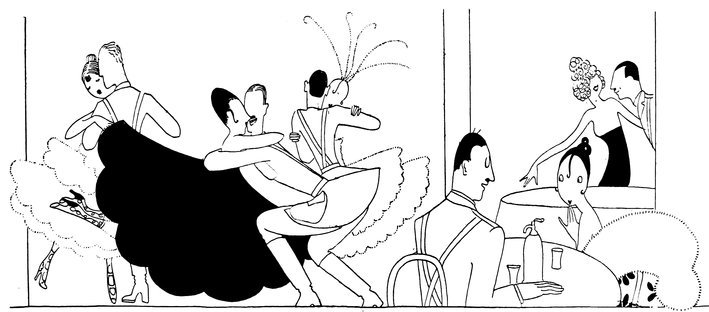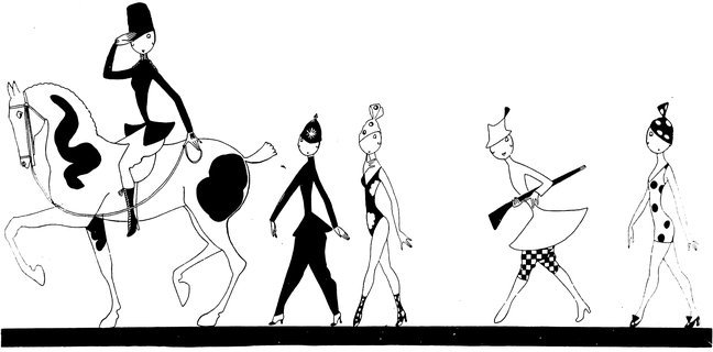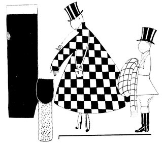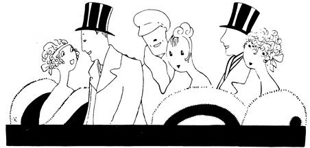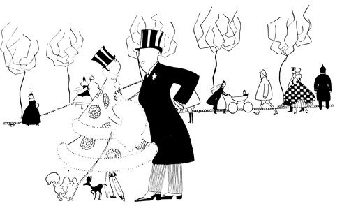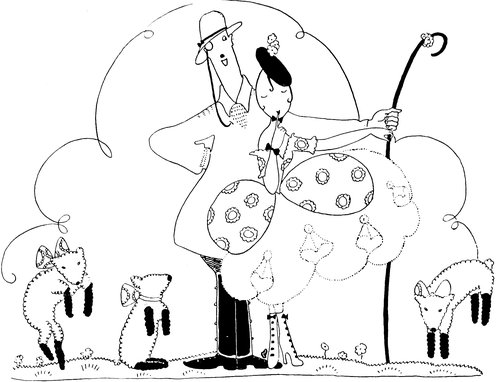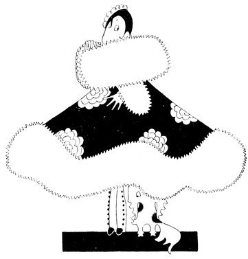 Moreover, Eve never draws what I must call a “dead” figure. Everyone—everything, almost—is alive. Her animals—burlesques of animals though they be—are full of character and fun. Even such things as motor-cars, ships, and carriages—which, from the point of view of an artist painting nothing but the truth, are out of all proportion—possess a quaintness which somehow accords better with the picture than if they were perfect models of technical knowledge and drawing.
