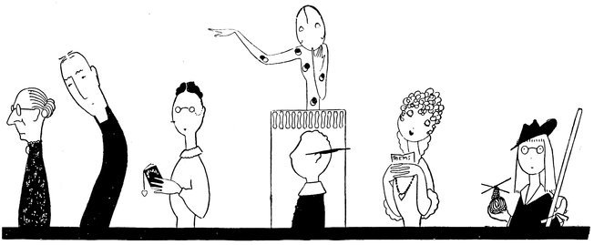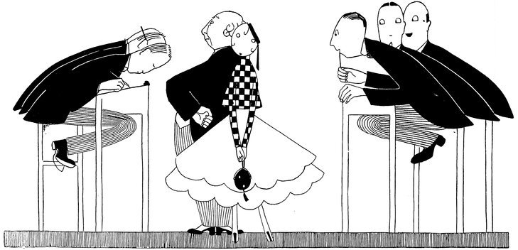 Next to be sent into an unhonoured obscurity are, reading from left to right—(1) The lady who advocates the equality of the sexes, with a suppressed predisposition towards emotional freedom; (2) The curate who has heard an early cuckoo and looses the news on a receptive press; (3) The lady with an insatiable desire to communicate with a “lonely soldier”; (4) The little boy who will recite; (5) The poetess whose spring ebullitions fill the corners of the papers; (6) The little girl scout who desires to blend patriotism with publicity—on her knitting activities