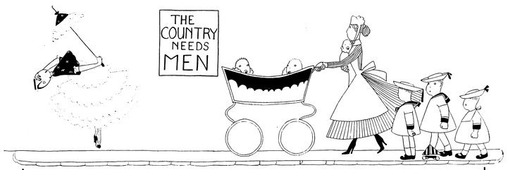 However, all troubles come eventually to an end, and Adam, poor dear, just back from the trenches, learns at last what real fear means. The fat rolling lines at the bottom of the picture are supposed to represent the dust which kindly Nature raised to hide the casualties in Eve’s wake, but in reality they were put in to hide Eve’s weakness in drawing car wheels