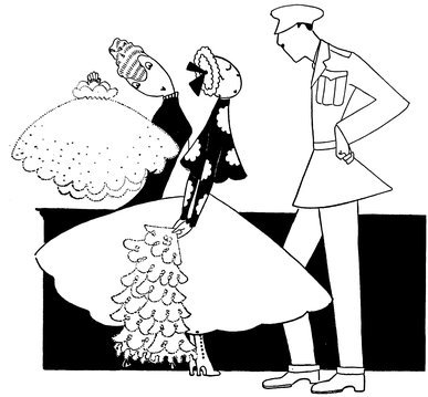 Patriotic women are energetically undertaking the work of Adams engaged in military duties. Eve desires to form a corps to supplement “the Methusiliers” or “the Last Gaspers” in case of invasion. Here is Eve being sworn in—a new experience, though, thanks to Uncle Fred, she is used to being sworn at