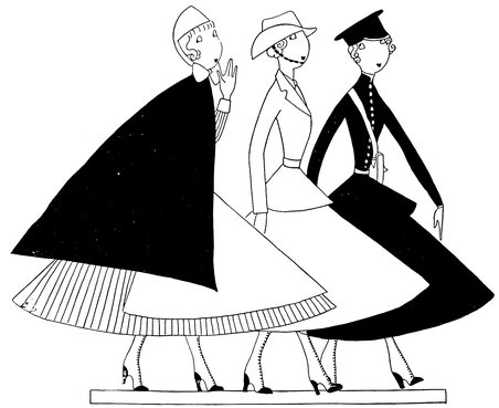 Those people who were wont to think the tight skirt unwomanly are hoping that the full skirt will bring back the modesty of the Victorian era. Eve hopes so, too; here she is in the new spotted veil cultivating a demure expression