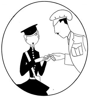 Here we have the wet and warm farewells on the parental doorstep. We have sternly pointed out to Eve that her costume is not the regulation one for the nursing sisterhood; but, as Eve says, all that matters is to look nice and be nice