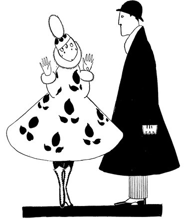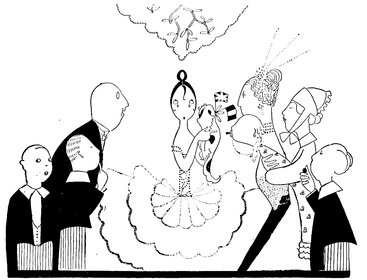 The successful invasion of the London stage by American artistes induces Eve to abandon her habitual reserve and appear (for charity) in a revue especially written for her by Sir Peter Pan. In order to avoid shocking the susceptibilities of the “past smart set,” who are these war times very early-Victorian, she has depicted herself at the moment when her scarcity of costume was obliterated by the mass of floral tributes hurled by an enraptured audience